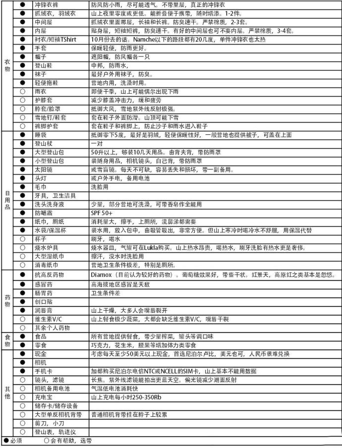 2. 常规药品,登山杖,墨镜(防止雪盲症),合脚的防水徒步鞋