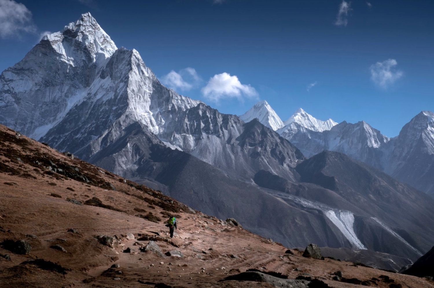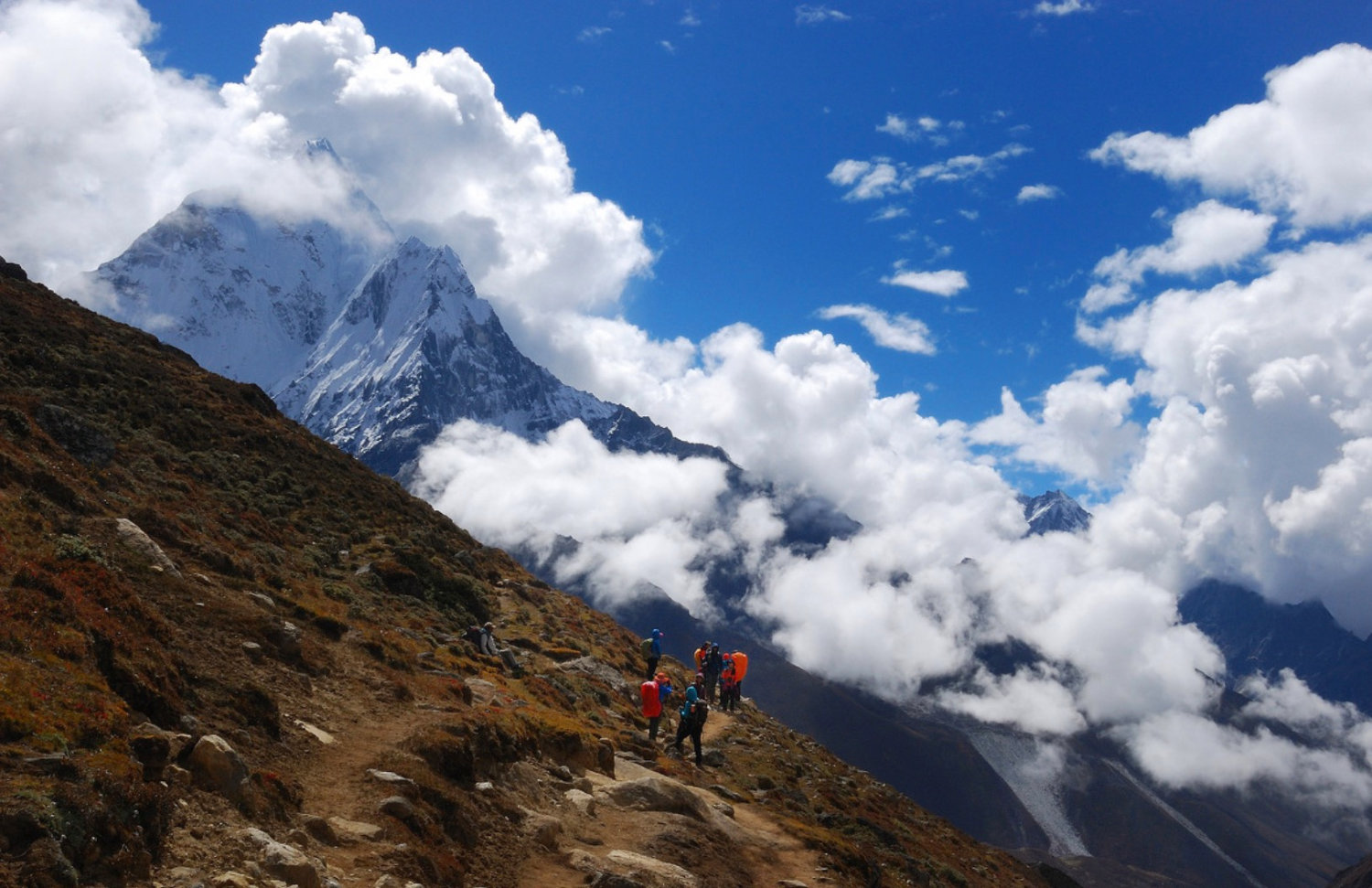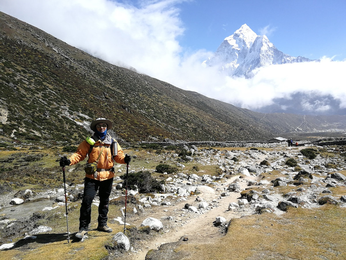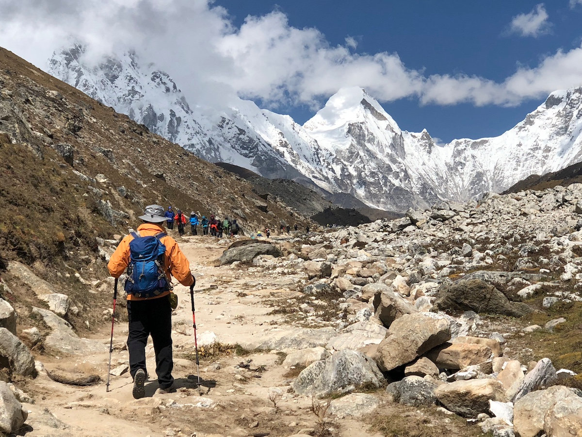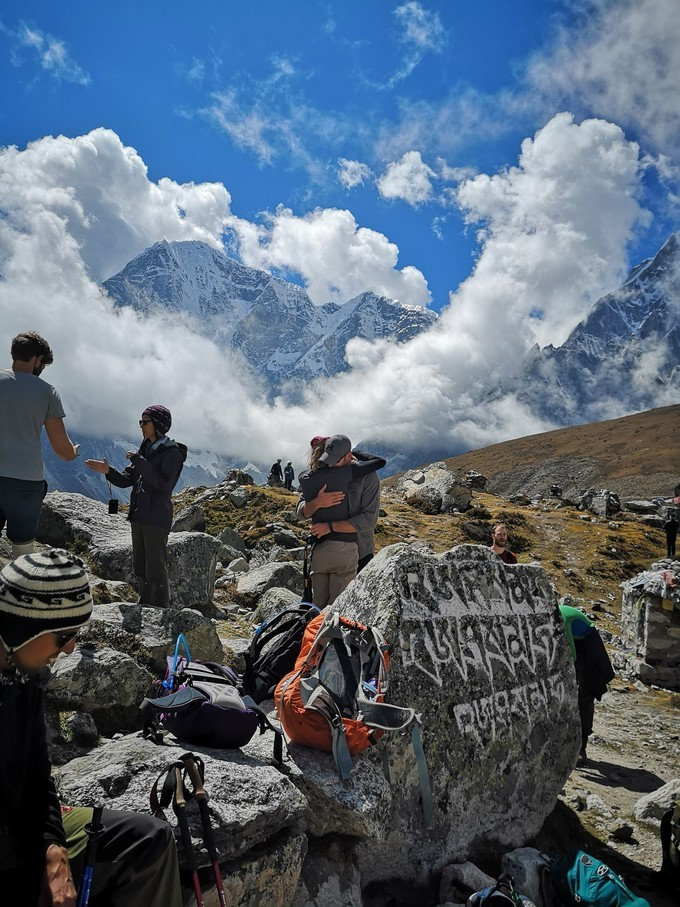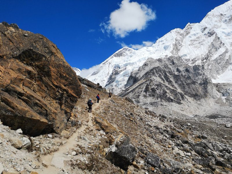 沿着半山腰徒步去罗布切,途中要经过一个玛尼堆群,纪念在登山中不幸遇难的夏尔巴人和登山者。我们已经开始接近昆布冰川,并且已经可以看到一些诸如普莫里、昆布子、林阡的山峰,但是世界巅峰仍然隐藏在雪山之后,让人捉摸不透。