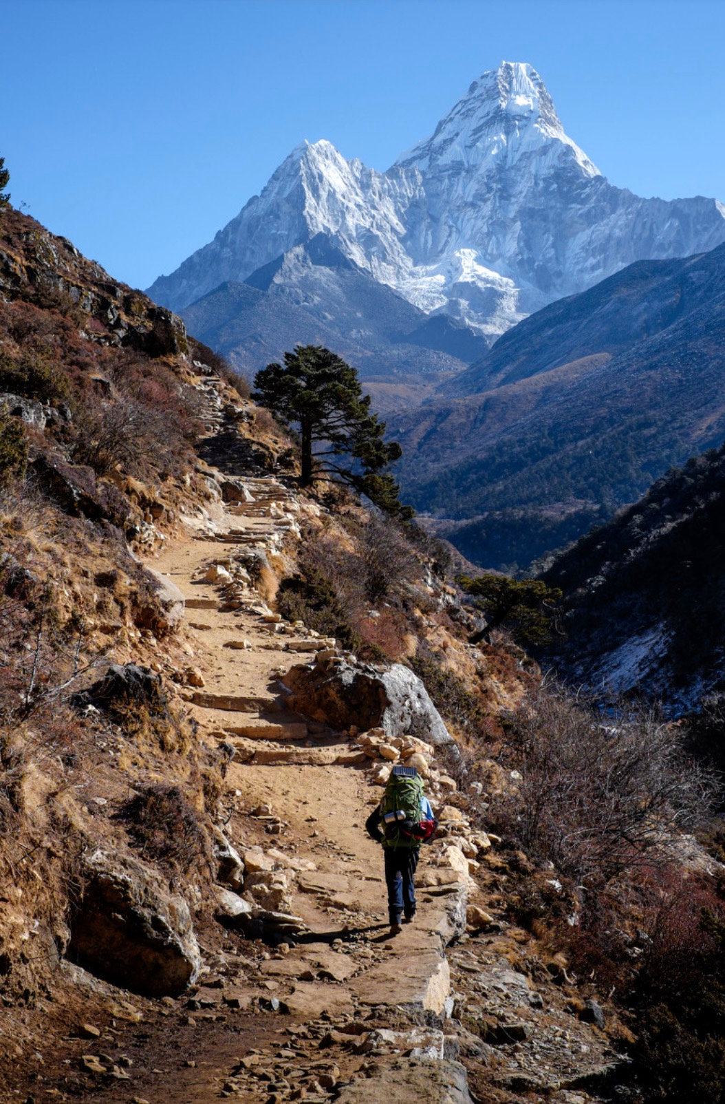 早晨用完早餐出发,这段路的风景尤其壮观,天气晴朗的情况下,可以看见珠峰、洛子、阿玛达布朗群峰,期间有一段600米的连续上坡。天波切的风景非常美,天气晴朗的时候,在客栈的房间,打开窗户,就可以看见世界巅峰齐聚的震撼美景。