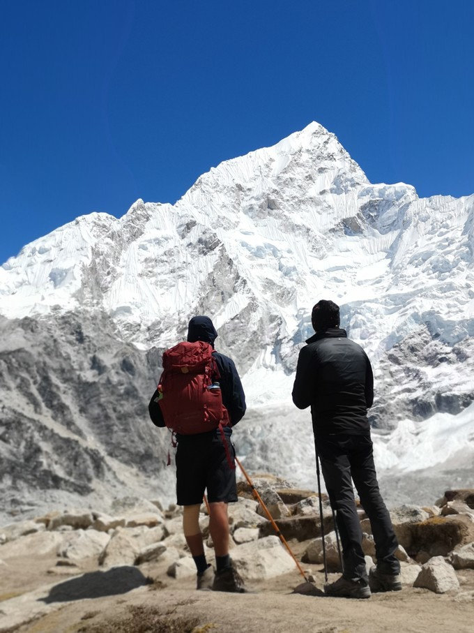 三座著名的雪峰出现在正前方,这就是海拔7161米的普莫里峰(Pumori),Lingtren峰和Khumbutse峰。右侧则是海拔7879米的努子峰。仰望四周,这里无一不是世界级著名雪峰,真正来到了雪山世界。