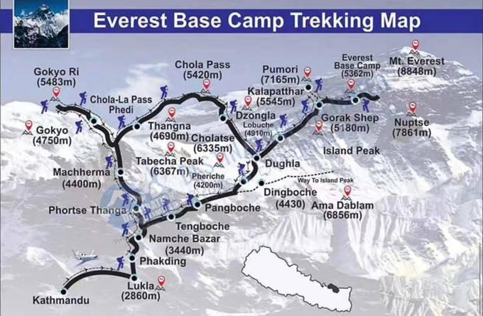 这是EBC最为经典的一条徒步线路,它包括上两个观景点Gokyo-ri(5337m)和Kala Pathar(5550m),去EBC(珠峰大本营),Gokyo第5湖,穿越海拔5300米的Cho La垭口。按照一般国外游客的安排和向导的建议,走完全程约18天左右,在Namche Bazar(3440m)和Dingboche(4410m)都会安排休整。每天的徒步时间约3—6小时,每天住宿地的海拔上升都在500米以内,以充分适应高原。而对于经常爬山的中国驴友而言,一般15天左右可以走完。
