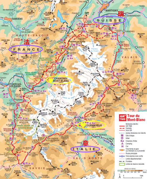 ▲TMB(上图红线,含支线)位于法国、意大利、瑞士三国边境,全程约166km,通常需分7-10天走完。上图以黄色爱心突出两个小镇,左是法国的Chamonix霞慕尼小镇,通常作为起终点;右是意大利的Courmayeur库马约尔小镇,通常作为中途的重要补给点。