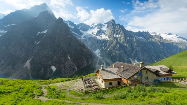 今天,我们将从博纳蒂小屋(Refuge Bonatti)出发,开始我们的徒步穿越。我们将顺着起伏的小路而上,登顶海拔2227米的萨克思山峰(Mont de la Saxe),此处便是观赏意大利境内勃朗峰南坡风景的绝佳位置之一,伯特瑞峰(Aiguilles de Peuterey)高耸挺拔,巍峨雄壮,尽收眼底。